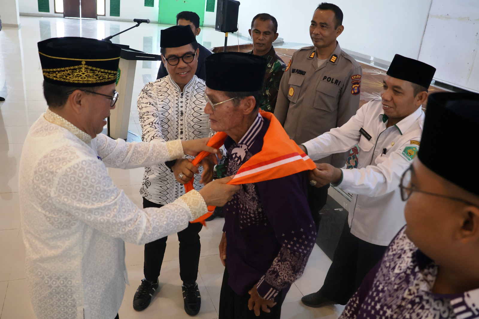 Pemasangan kain Sal secara simbolis kepada perwakilan calon jamaah haji di penghujung acara menjadi simbol pelepasan jamaah secara resmi di PPU. (Sumber Humas Pemkab PPU)